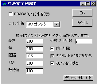 ・寸法文字列のフォントの属性を設定します ・数字は全て図面出力サイズとなります ・設定した数値の標準値がわからなくなった場合は「デフォルトにする」を押すことで、 ソフト購入時の既定値へ戻す事ができます |