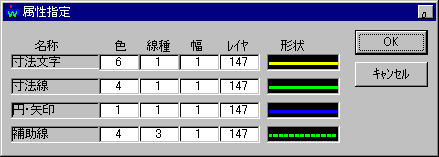 | ・ 寸法文字、寸法線、円・矢印、補助線 の色、線種、幅、レイヤ番号を設定します | |||