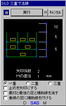 ・一重、二重、三重の3パターンに切り替えられます ・寸法の玉止めを 円、矢印より選択できます ・円の直径と 矢印係数を設定できます ・グループ番号が、寸法を作図する度に自動で割付けられます |