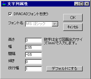 ・記号文字列のフォントの設定をします ・数字は全て図面出力サイズとなります ・設定した数値の標準値がわからなくなった場合は「デフォルトにする」を押す事で、ソフト購入時の既定値へ戻す事ができます |