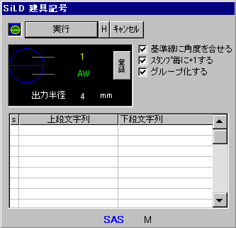 ・セットボタン(S)をクリックするだけで、簡単に建具記号を作図できます ・円の大きさを任意に設定できます (円の大きさは登録されません) ・建具種類を100タイプまで登録できます (登録ボタンをクリックするだけで 自動登録されます) ・基準線に合わせて 記号に角度がつけられます ・作図する毎に数値を1づつ増加します ・グループ番号が、記号を作図する度に自動で割り付けられます |