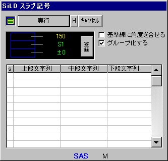 ・ セットボタン(S)をクリックするだけで、簡単にスラブ・室名記号を作図できます ・ 記号内容100タイプまで登録できます (登録ボタンをクリックするだけで 自動卯登録されます) ・ 基準線に合わせて記号に角度がつけられます ・ グループ番号が、記号を作図する度に自動で割付けられます |