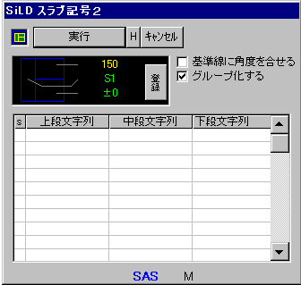 ・ セットボタン(S)をクリックするだけで、簡単にスラブ・室名記号を作図できます ・ 文字列の長さより自動判断して、枠が作図されます (必ず、枠内に文字が納まります) ・ 記号内容を100タイプまで登録できます (登録ボタンをクリックするだけで 自動登録されます) ・ 基準線に合わせて記号に角度がつけられます ・ グループ番号が、記号を作図する度に自動で割付けられます |