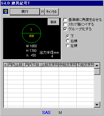 ・ セットボタン(S)をクリックするだけで、建具記号を作図できます ・ 円の大きさを任意に設定できます (円の大きさは登録されません) ・ 建具種類を100タイプまで登録するできます (登録ボタンをクリックするだけで 自動登録されます) ・ 基準線に合わせて記号に角度がつけられます ・ 作図する毎に数値を1づつ増加することができます。 ・ グループ番号が、記号を作図する度に自動で割付けられます ・ 寸法の表示位置を 記号の下、右横、左横から選べます |