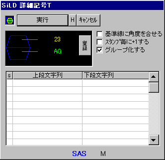 ・ セットボタン(s)をクリックするだけで、簡単に詳細記号を作図できます ・ 文字列の長さより自動判断して、枠が作図されます (必ず、枠内に文字が納まります) ・ 記号内容を100タイプまで登録できます (登録ボタンをクリックするだけで 自動登録されます) ・ 作図する毎に数値を1づつ増加します ・ 基準線に合わせて記号に角度がつけられます ・ グループ番号が、記号を作図する度に自動で割付けられます |