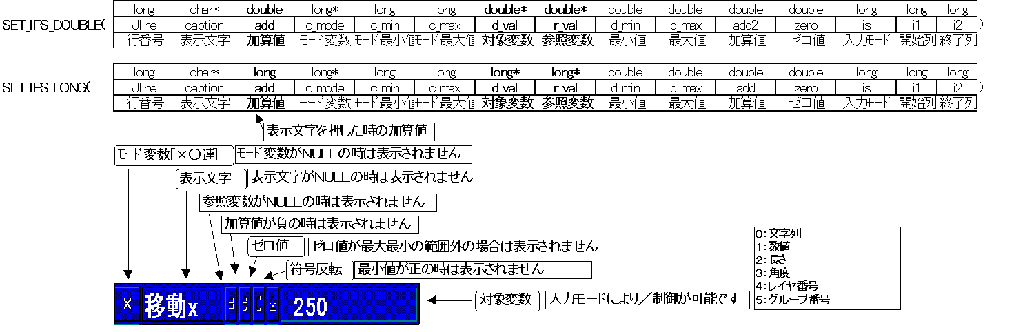 SET_IPS_DOUBLE(1,”距離”,&d_mode,0,1,&d_val,NULL,0,9000,10,0,c_IS_LENGTH,0,NF-1)